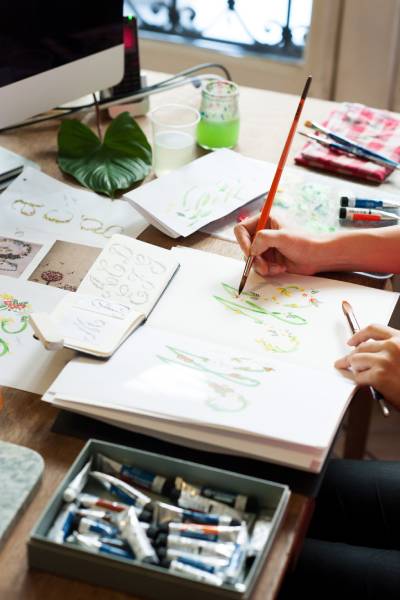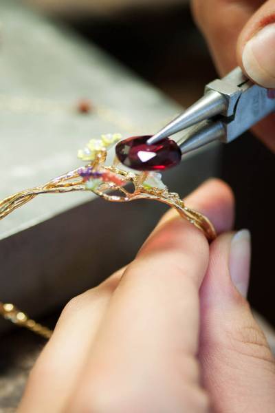 Each piece of jewelry is born from a design straight from the imagination of the creators. As in fine jewelry, the pieces are “gouacheed”. The jewelry is then manufactured and subtly painted by hand using the enamelling technique. Each floral or animal detail is colored with a brush with great subtlety in the choice of colors. A meticulous task, where every detail is the result of the handwork of an artisan.